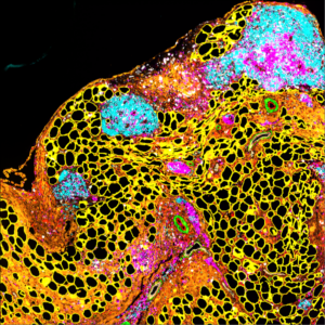 This image offers a glimpse into the tumour microenvironment of metastatic ovarian cancer in a mouse model, caught at a moment of active response to a novel combination therapy that targets both cancer cells and the fibrotic network that supports them. Cancer does not grow in isolation—it reshapes its surroundings, recruiting blood vessels, manipulating immune cells, and remodelling the extracellular matrix (ECM), the fibrous scaffold that holds tissues together.