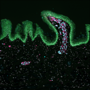 The tongue is a multifunctional tissue involved in speech, eating and taste, while also serving as a protective barrier. Shown here is the bumpy surface of the tongue, called lingual papillae, that help to protect underlying cells from mechanical/chemical/physical stress. Some lingual papillae also house taste buds. This image shows nerve fibres reaching into the papilla, surrounded by support cells known as glia. Staining shows nerve terminals (pink), glia (cyan), epithelium (green) and nuclei (grey) in human developmental dorsal tongue.