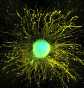 This image shows a tiny cluster of human neurons, around 1mm across, grown in the laboratory. The bright blue centre marks a group of neuronal cell bodies, with yellow neurites extending outward that mimic the behaviour of neurons in the brain. These neurons were made from human stem cells grown in a dish. By studying neurons formed this way, scientists can explore how neurons develop, connect, and malfunction in disease, helping to improve future treatments.